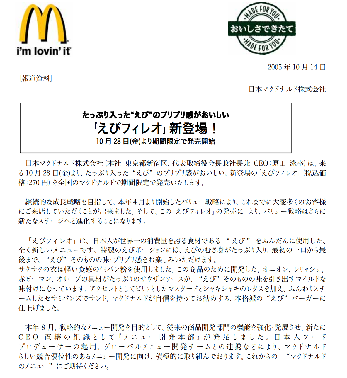 商品面において、原田CEOは高単価商品の開発を決定した。第一弾として2005年10〜11月に「えびフィレオ」を期間限定で発売し、2006年1月にレギュラーメニューに昇格した。エビフィレオの価格は、税込みで単品270円・バリューセット580円で設定された。