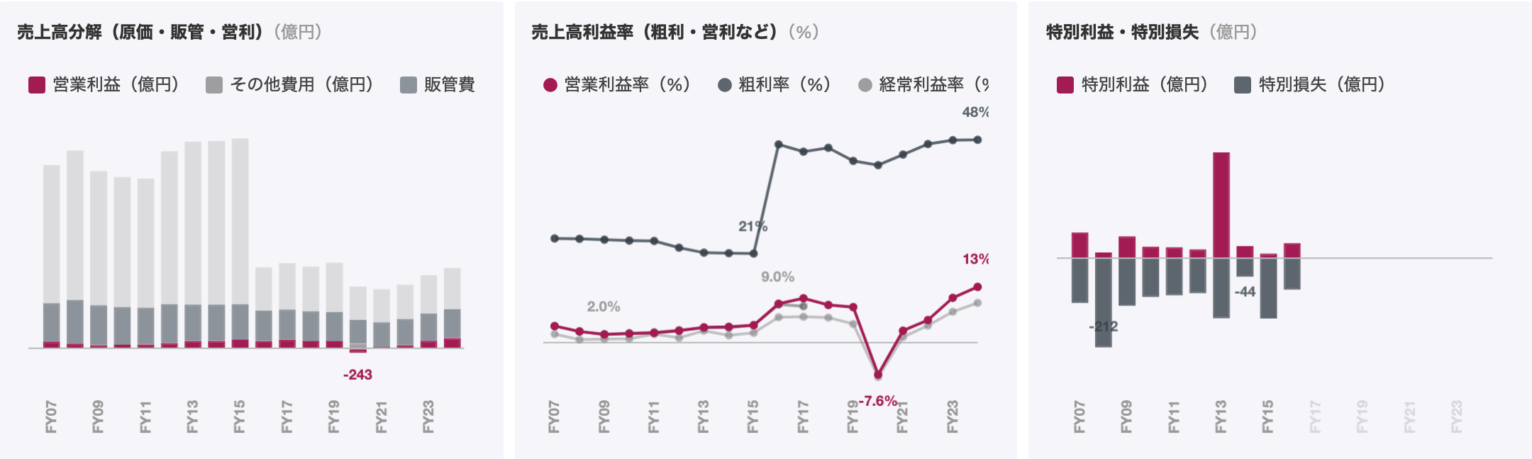 同時期には百貨店事業の固定費削減も進み、2019年度比で約80億円のコスト圧縮を達成した。売上増に対して利益が跳ね上がりやすい損益構造が早期に整い、2022年後半からのインバウンド回復でそのまま業績回復のスピードに直結した。決算説明会では経営陣が、固定費削減が完了し売上増に対して利益が跳ね上がる構造へ移ったとの認識を示し、財務面とコスト面の構造転換が最高益達成へ向けた経営の土台を築いた。定借化による変動費比率の引き上げと固定費の圧縮が並行した結果、同社の損益分岐点はコロナ前より低い水準に再設計された。コロナ禍で傷んだバランスシートの修復と、回復期を迎え撃つ損益構造の組み替えが同時進行した点が、この2年間を業績反転の助走期に変えた。