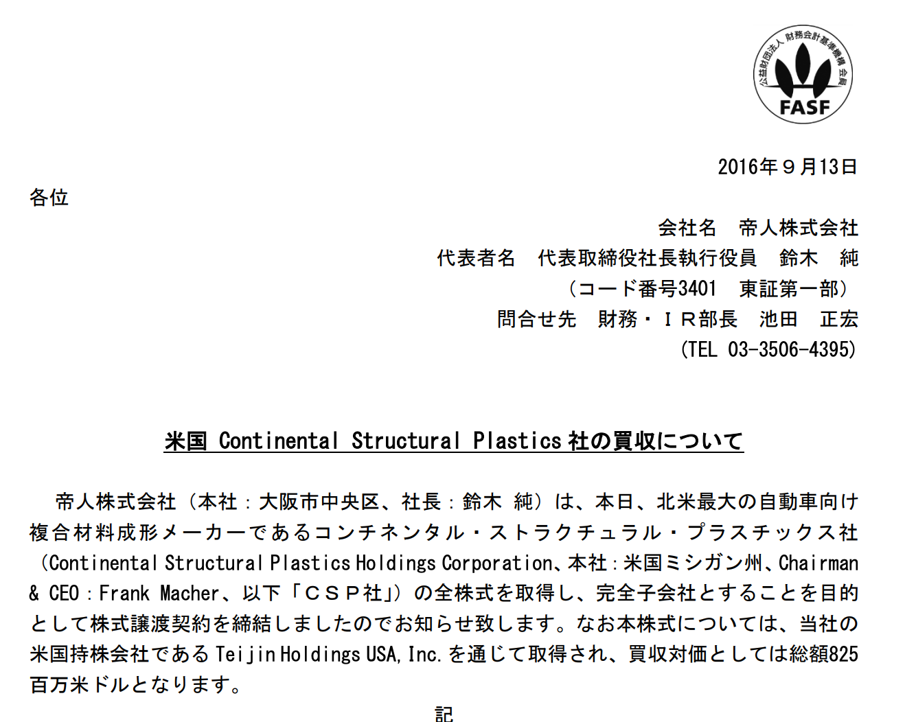 2017年1月に帝人は米国の自動車部品メーカーContinental Structural Plastic社を買収した。取得原価は850億円で100%の株式を取得。帝人の自動車部品領域(マテリアル)における巨額買収となった。