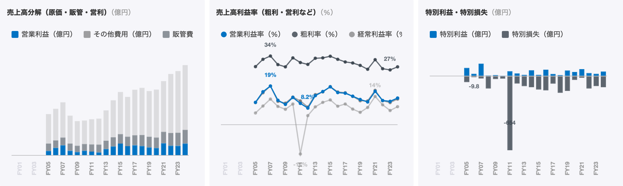 2024年3月期、売上高は為替円安効果で5789億円と過去最高を更新したが、営業利益664億円(前期比▲1%)、当期純利益406億円(同▲26%)と利益は減少した。中国スマホ低迷継続で業績悪化したセラミックパッケージ事業等で減損損失を計上したことが純利益を押し下げた。デジタルソサエティ事業は半導体市場悪化を受けた半導体メーカーの投資抑制で大幅減収減益、エンバイロメント事業は自動車生産回復で増収増益という対照的な動きだった。