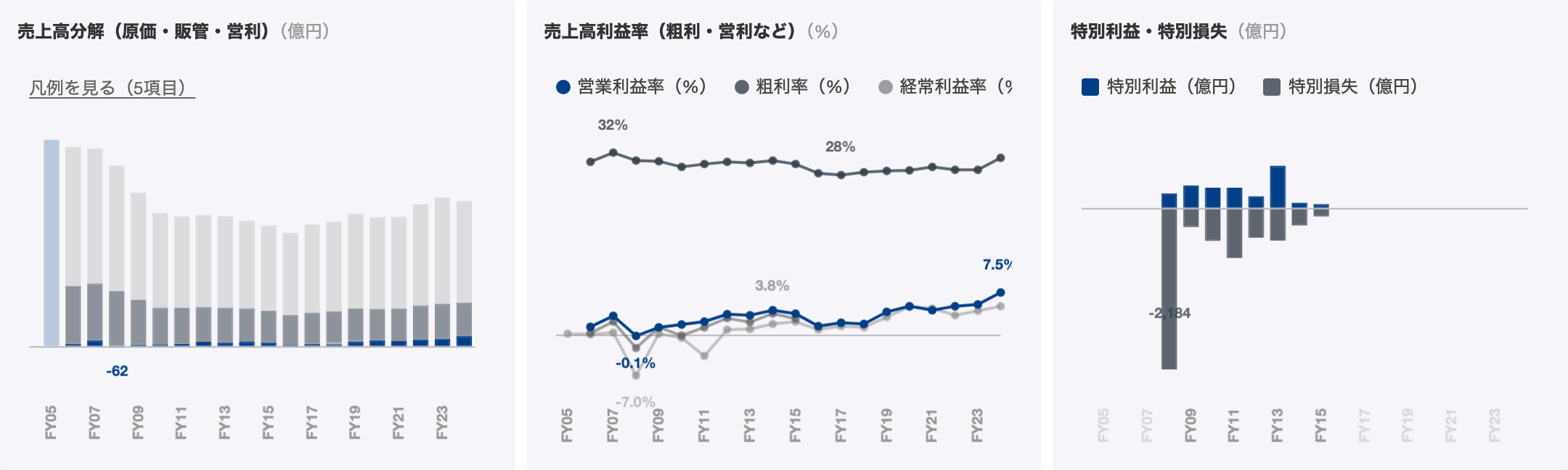 そこから10年以上にわたって、NECは「何を捨てるか」の繰り返しで身軽になった。2010年にはNECエレクトロニクスをルネサスへ統合し、2013年にはスマートフォン事業から撤退、2014年にはBIGLOBEを売却、2025年には従来型の5G基地局事業を終息させた。代わりに残した国内IT・セキュリティ・防衛の3領域に対して、2023年から本格始動したBluStellar戦略で収益上積みを仕掛け、2025年3月期には連結営業利益2565億円と、過去最高水準の数字を記録した。同年10月には米CSG社を約4417億円で買収する攻めの一手に転じ、長らく続いた「捨て続ける」フェーズから海外を買いに行くフェーズへと軸足を移した。1999年の過去最大1500億円赤字、2009年の2966億円赤字という二度の大赤字を経て、ようやく収益性の高い事業ポートフォリオに作り替わった局面である。