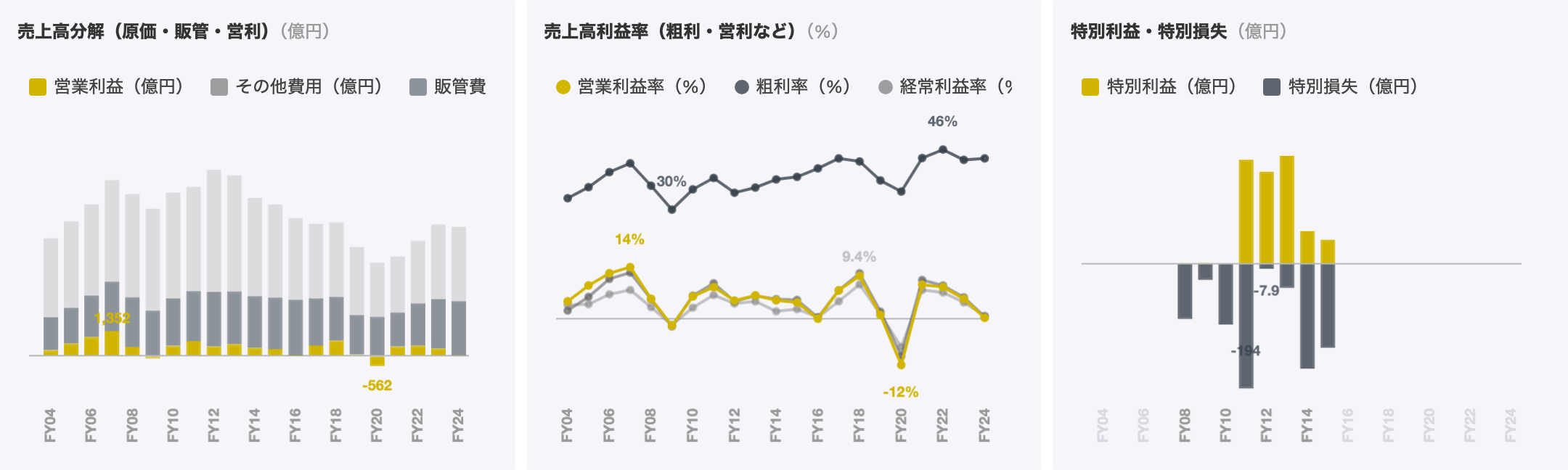 ヘルスケア事業の中核であるOptosを含めて全社ののれん残高は減損処理後でも約300億円に及び、識別可能無形資産と合わせて毎期一定の償却負担が収益を抑制する構造は当面変わらない。横浜製作所の売却プロセスも進行中で、生産拠点の再配置を通じた固定費削減と、映像・精機・ヘルスケア・コンポーネントの4事業セグメント間での資源再配分が並行して進められている。映像事業では、メモリー価格の上昇が来期のマイナス要因として既に認識されており、米国関税影響約70億円の6割程度がこの事業に帰着する構造も重石となっている。為替・地政学・半導体市況という3つの外部変数に対して、事業ポートフォリオ全体としての感応度をどこまで低減できるかが問われている。徳成は「CFO経験を活かし、ニコンを1兆円企業にする」(マンスリーみつびし 2024/10/17)と財務規律と成長の両立を掲げる。