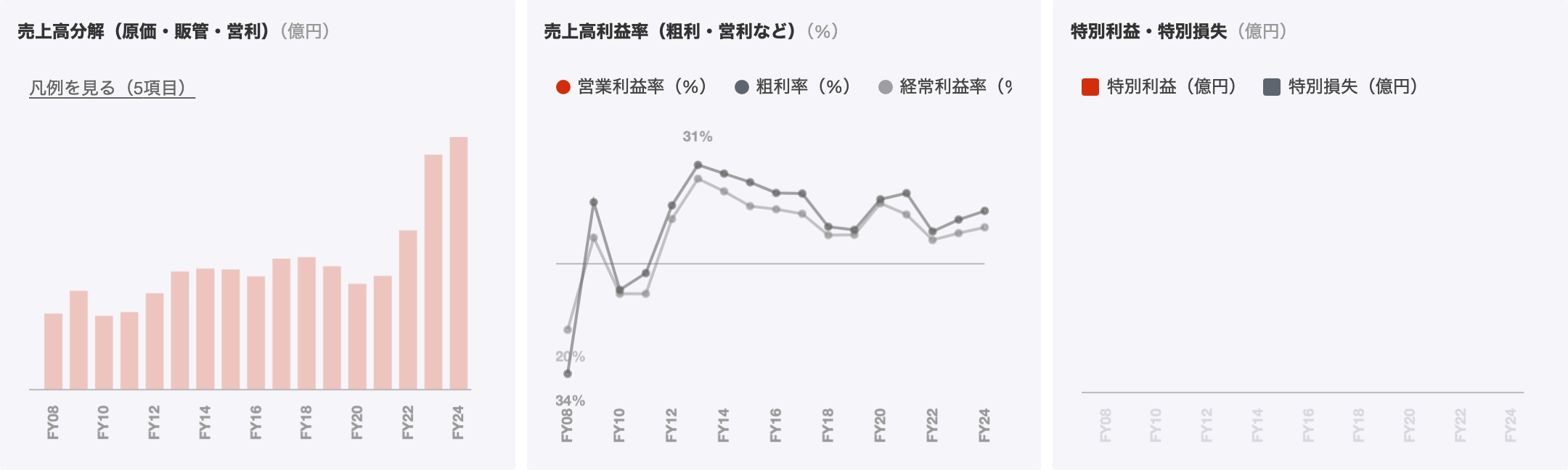 2025年3月期の連結営業収益は1兆3720億円、経常利益2247億円、親会社株主帰属当期純利益1543億円となり、前期から増収増益を維持した。同年から開示セグメントは「ウェルスマネジメント」「アセットマネジメント」「グローバル・マーケッツ&インベストメント・バンキング」の3区分に再編され、ウェルスマネジメント部門の営業収益2403億円・利益806億円が示すとおり、リテール側の名称変更を含めて資産管理型への布陣の組み替えが進んだ。リーマン後の2期連続赤字の後、アベノミクス相場の上昇で立て直した経営体質を、相場依存からフィービジネス中心へ転換する試みが業績好調を支えに進んでいる。業界2位の収益源をホールセールのボラティリティからリテールの安定収益へ寄せる方向が、セグメント区分の再編からも読み取れる。