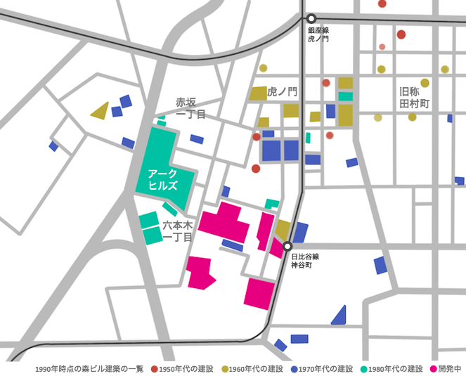 1985年に森ビルは大規模再開発の第一弾としてアークヒルズを竣工。オフィス、マンション、ホテルが併設した街を作り上げ、かつての不良住宅地区の付加価値向上に大きく寄与した。